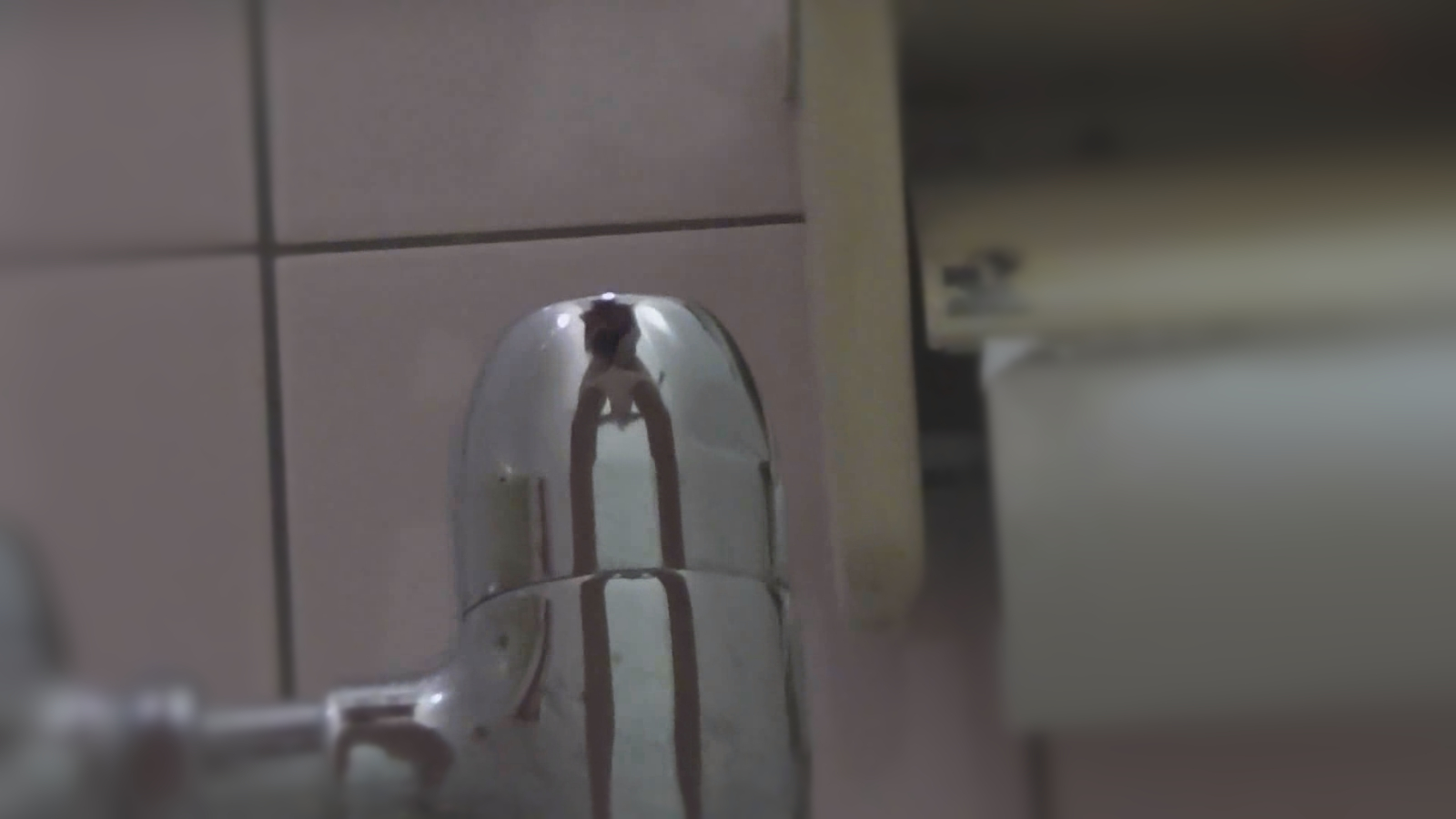 最後は退出後の洗面台の鏡越しのお顔拝見シーン!少しおちょぼ口ですが、大人系美人である事がクッキリと確認出来ますね!こんな美人が美尻を見せつけて、オリモノまで垂らしておしっこするなんて・・・
